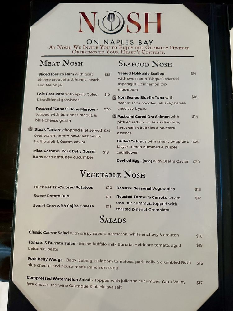 Welcome to Nosh on Naples Bay, a chic New American dining experience nestled along the scenic Naples Bay. This elegant establishment offers a harmonious blend of delectable cuisine and stunning waterfront views, making it an ideal spot for both casual diners and special occasions. Reservations are recommended as the intimate space fills quickly, especially during peak seasons.